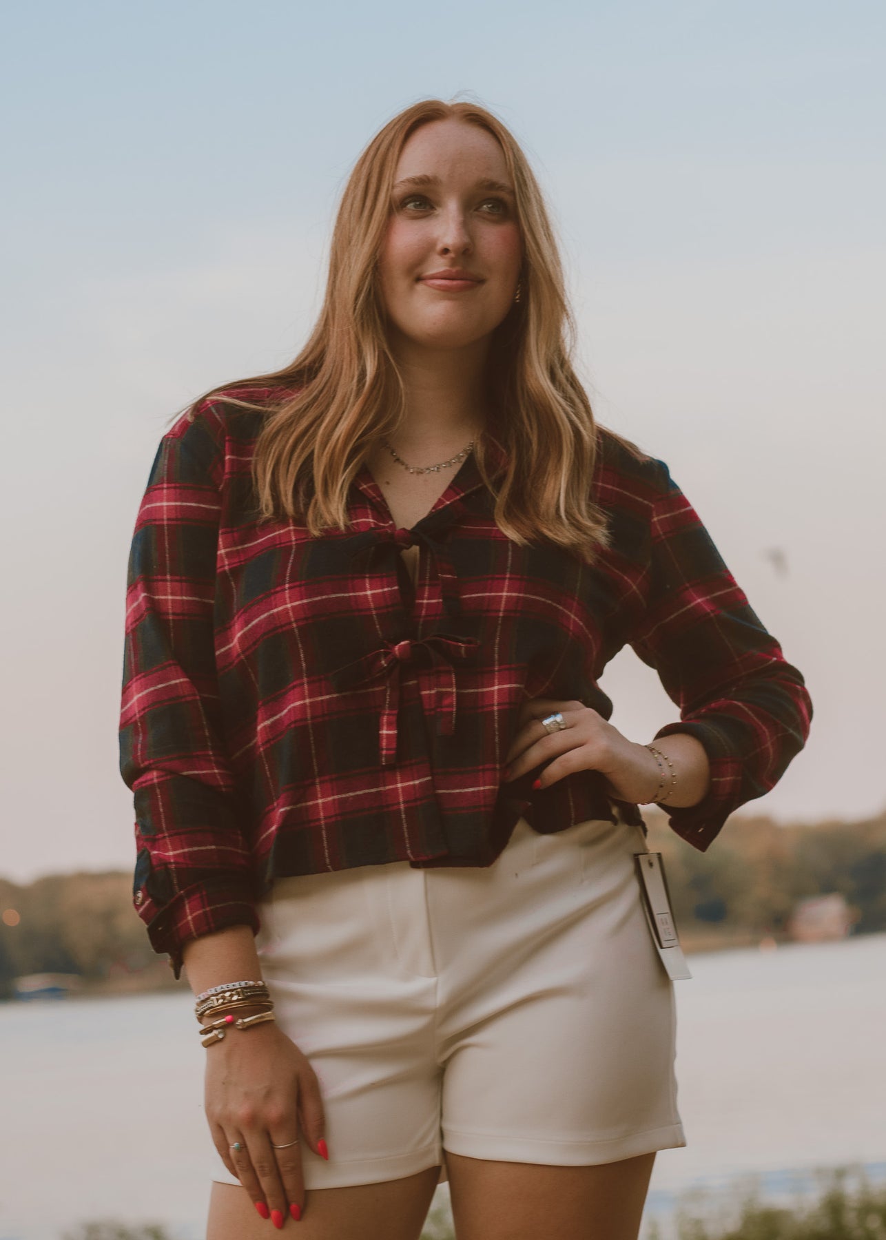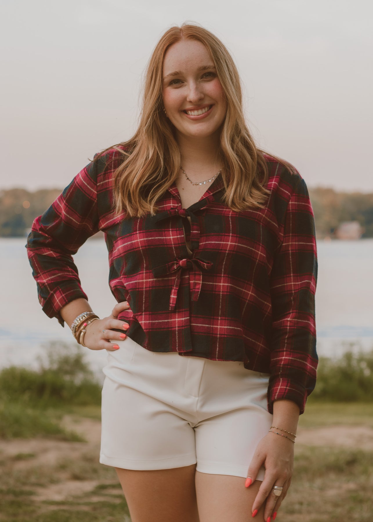 Stay effortlessly stylish in the Coastal Holiday Plaid top, featuring a playful red and navy pattern with a relaxed, loose fit. The charming front tie details add a fun, preppy touch, making it perfect for casual days or cozy get-togethers. This top combines comfort with cute flair to brighten up your wardrobe.