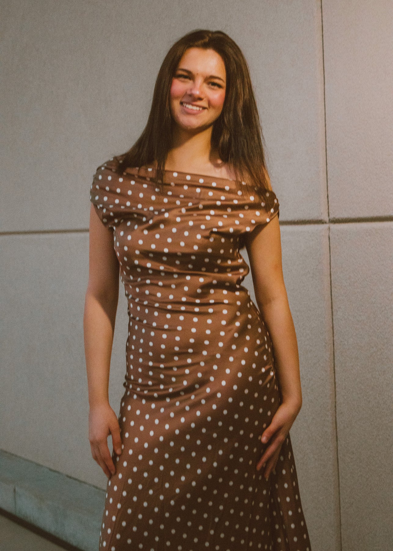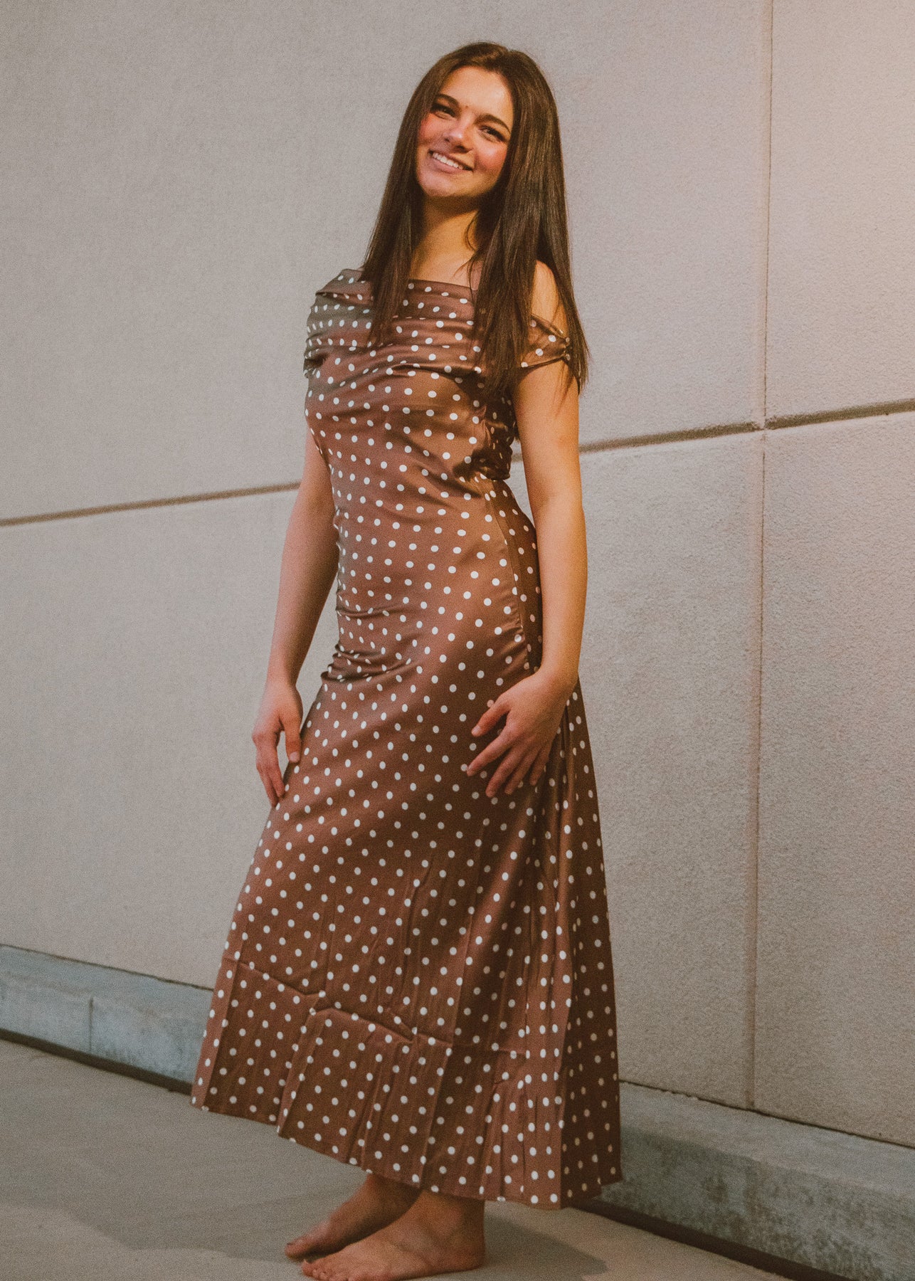 Timeless, elegant and effortlessly chic- this brown and cream polka dot dress channels MAJOR Pretty Woman vibes with a modern twist. The flattering silhouette drapes beautifully, featuring soft, flowing fabric that moves with you from ceremony to dance floor.