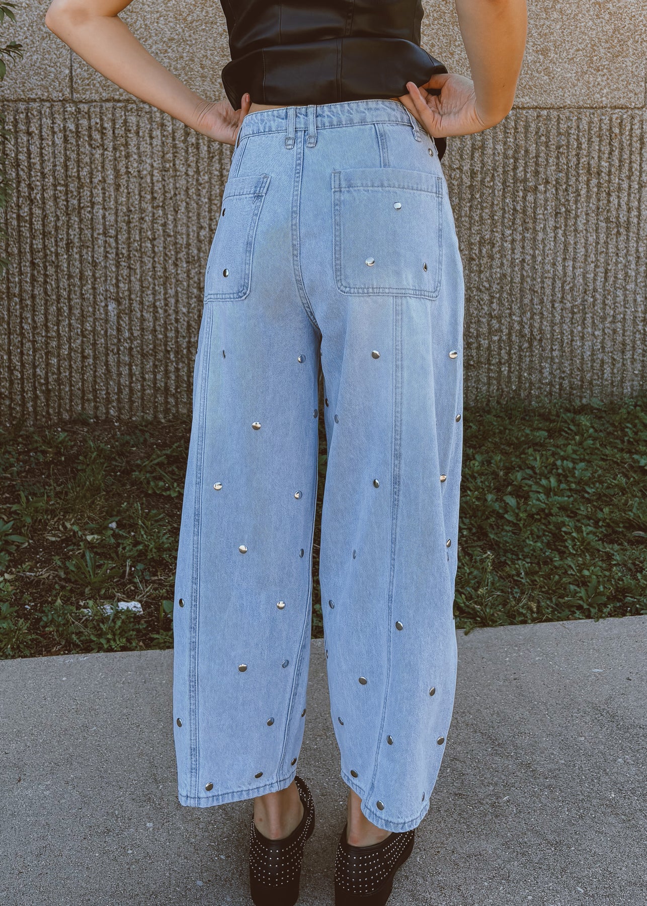 Step out with flair in the SoHo Studded Barrel Jeans, featuring charming circle medal studs that add a playful sparkle to your look. These stylish denim jeans combine a fun, unique barrel silhouette with eye-catching details, making them perfect for turning heads wherever you go. Effortlessly cute and trendy, they bring a fresh twist to your everyday wardrobe.
