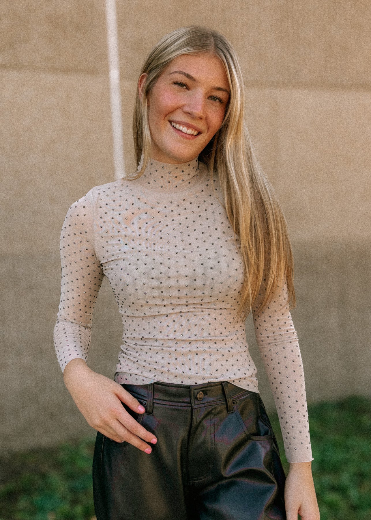 Woman wearing a beige long-sleeve top with rhinestones against a textured wall.