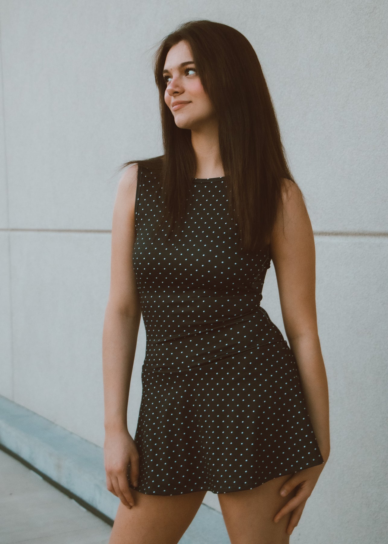 The Monroe Polka Dot Athletic Dress combines retro charm with modern performance. This playful black dress features crisp white polka dots that turn heads while you crush your workout. Built with stretchy, breathable fabric, it moves with you through cardio, yoga, or casual errands. The fitted silhouette flatters your figure without sacrificing comfort, making it the perfect piece for anyone who refuses to choose between style and function. Dress it up or keep it casual—either way, you'll look effortlessly cute.