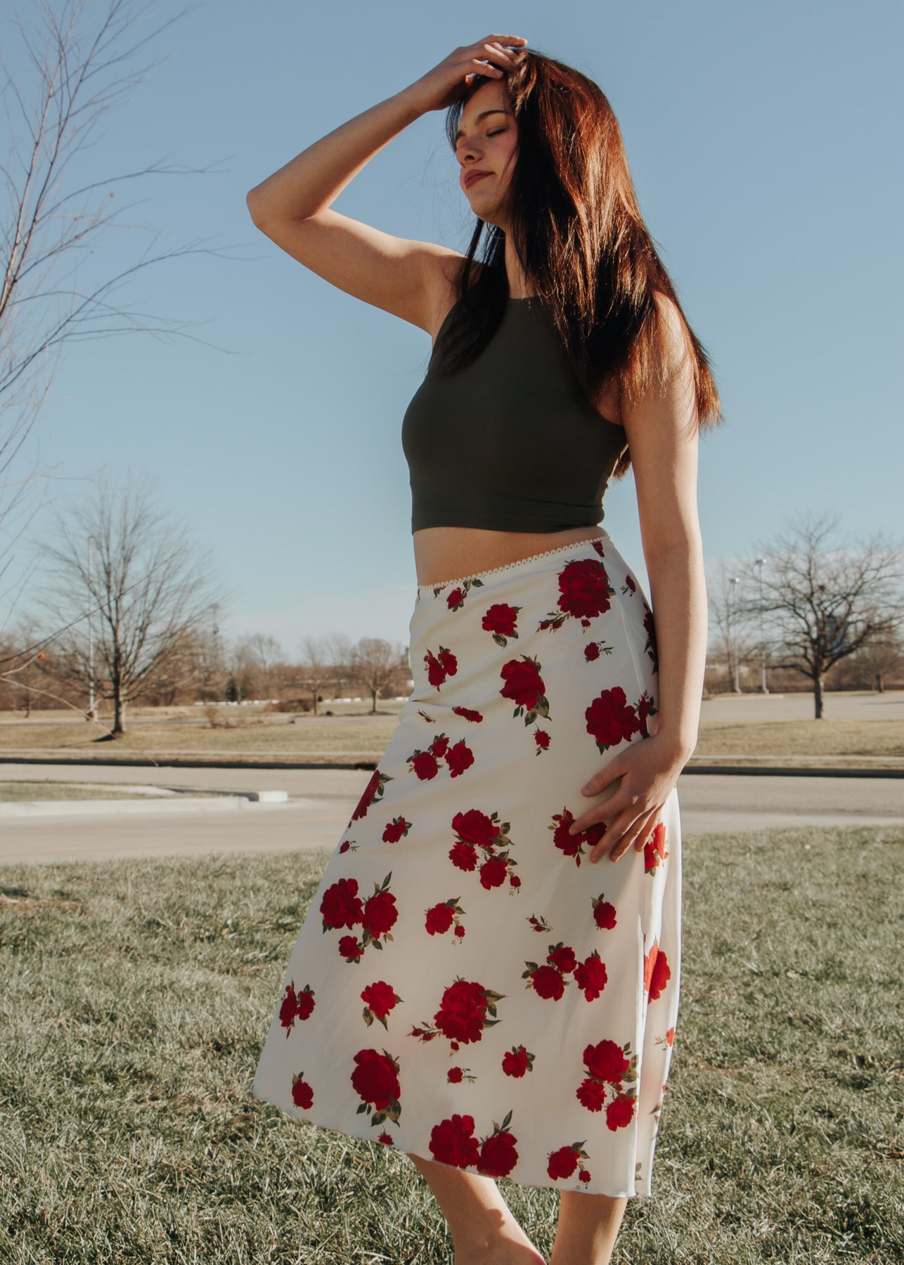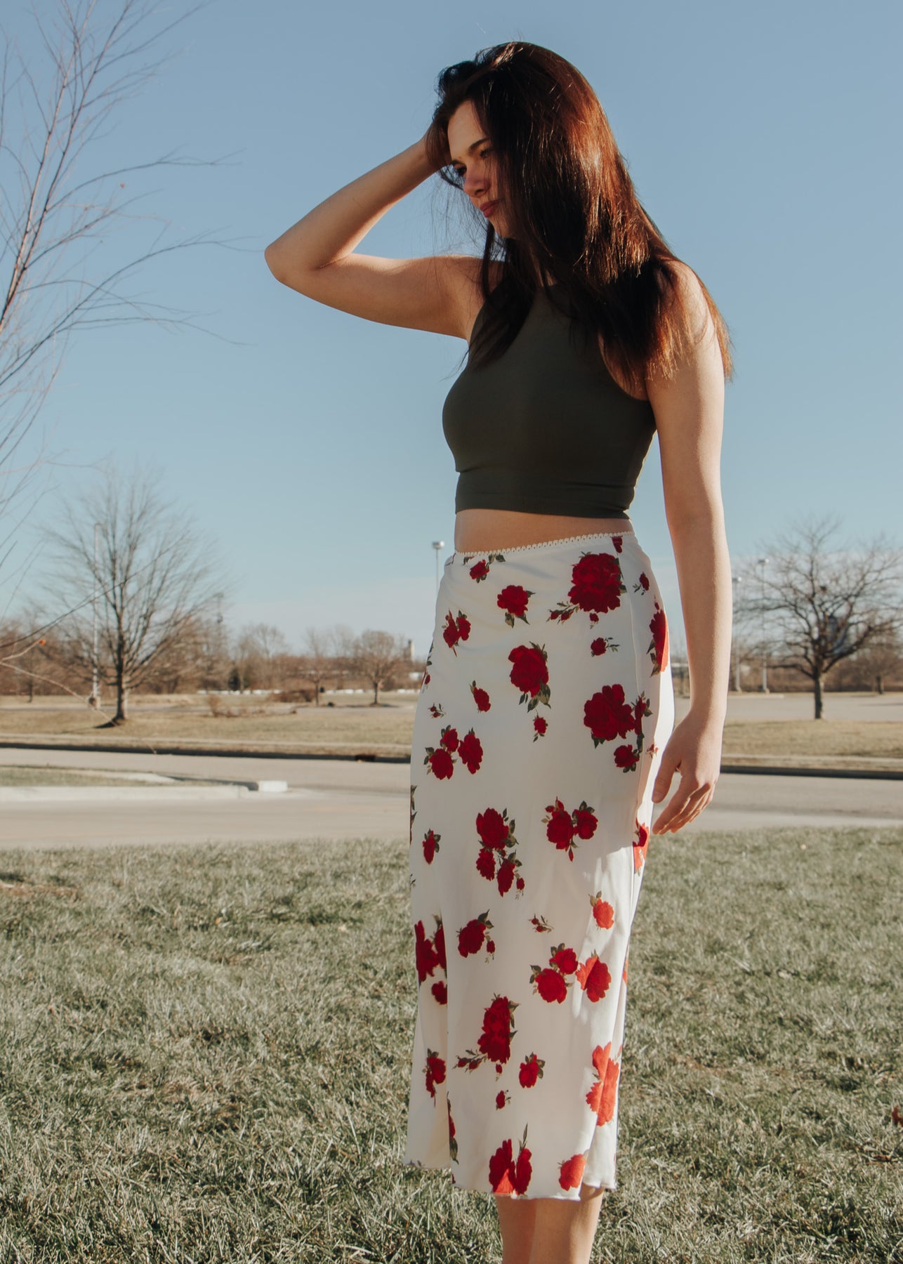 Twirl into romance with this enchanting midi skirt, where delicate roses bloom across luxurious silky fabric. The flowing white design hits at the perfect midi length, creating an effortlessly elegant silhouette that transitions seamlessly from brunch to evening plans. Soft, smooth material drapes beautifully while the rose detailing adds a touch of whimsy and charm. Perfect for anyone who loves a little floral magic in their wardrobe.