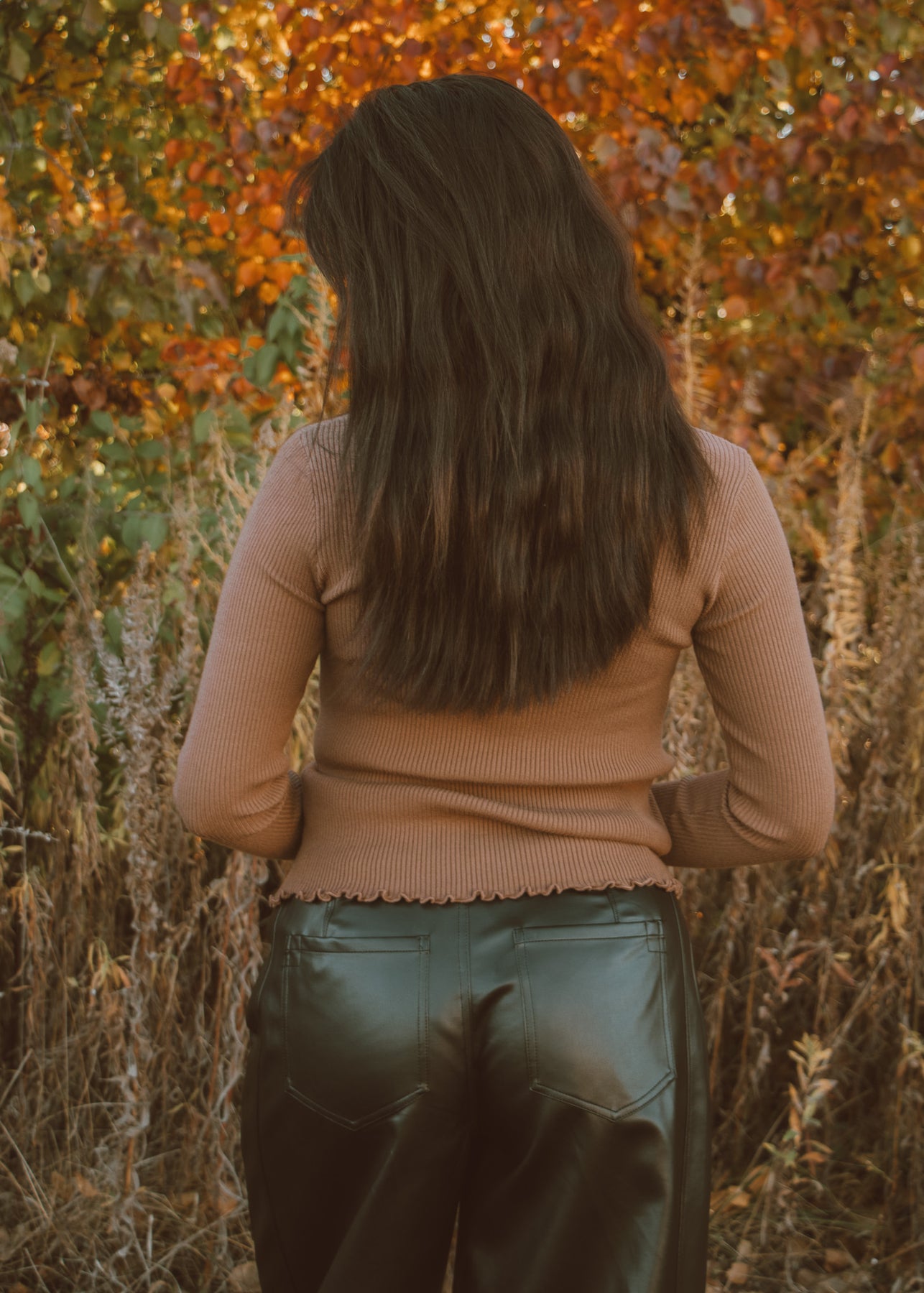 Woman wearing a brown ribbed top and leather pants standing in front of autumn foliage.