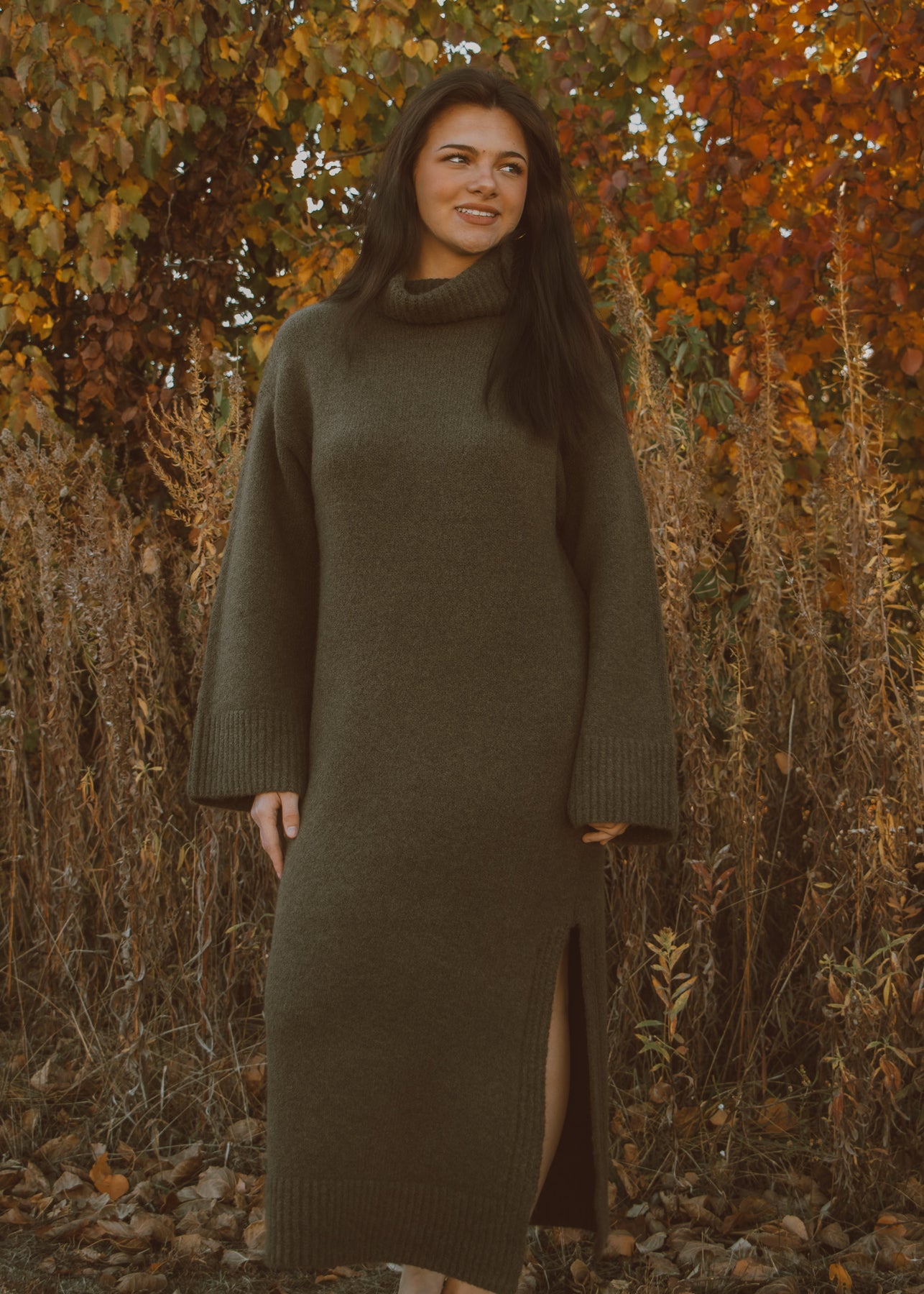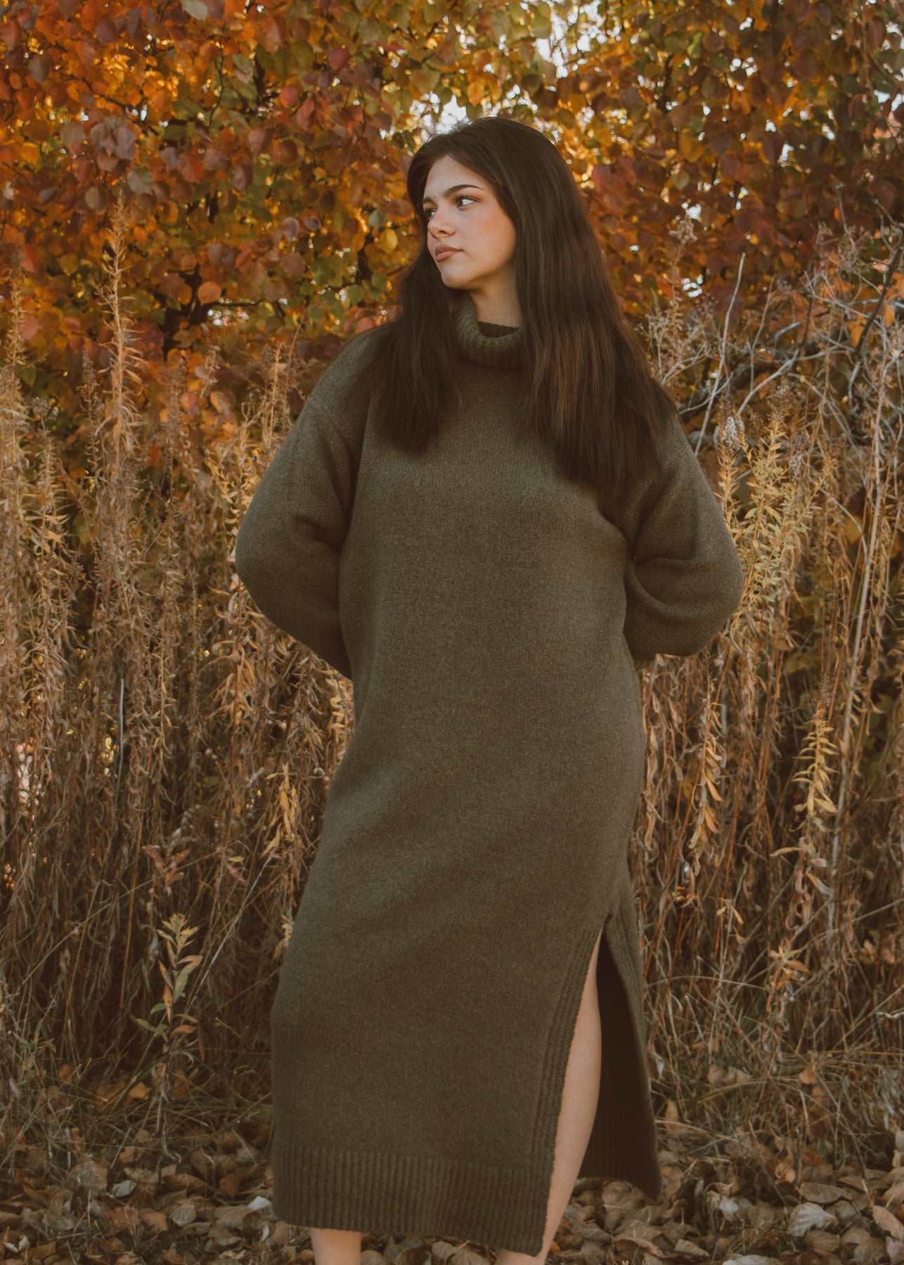 Woman wearing a long olive green turtleneck sweater dress in an autumn setting